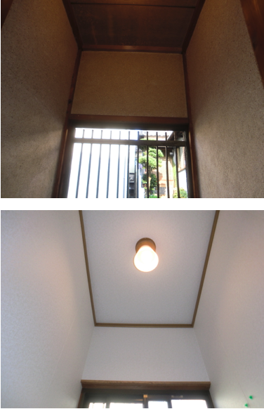 堺市北区のお客様のトイレリフォーム工事例です。壁タイル上には土壁がありますが、壁と天井の下地工事を行い天井・壁紙クロスを仕上げています。